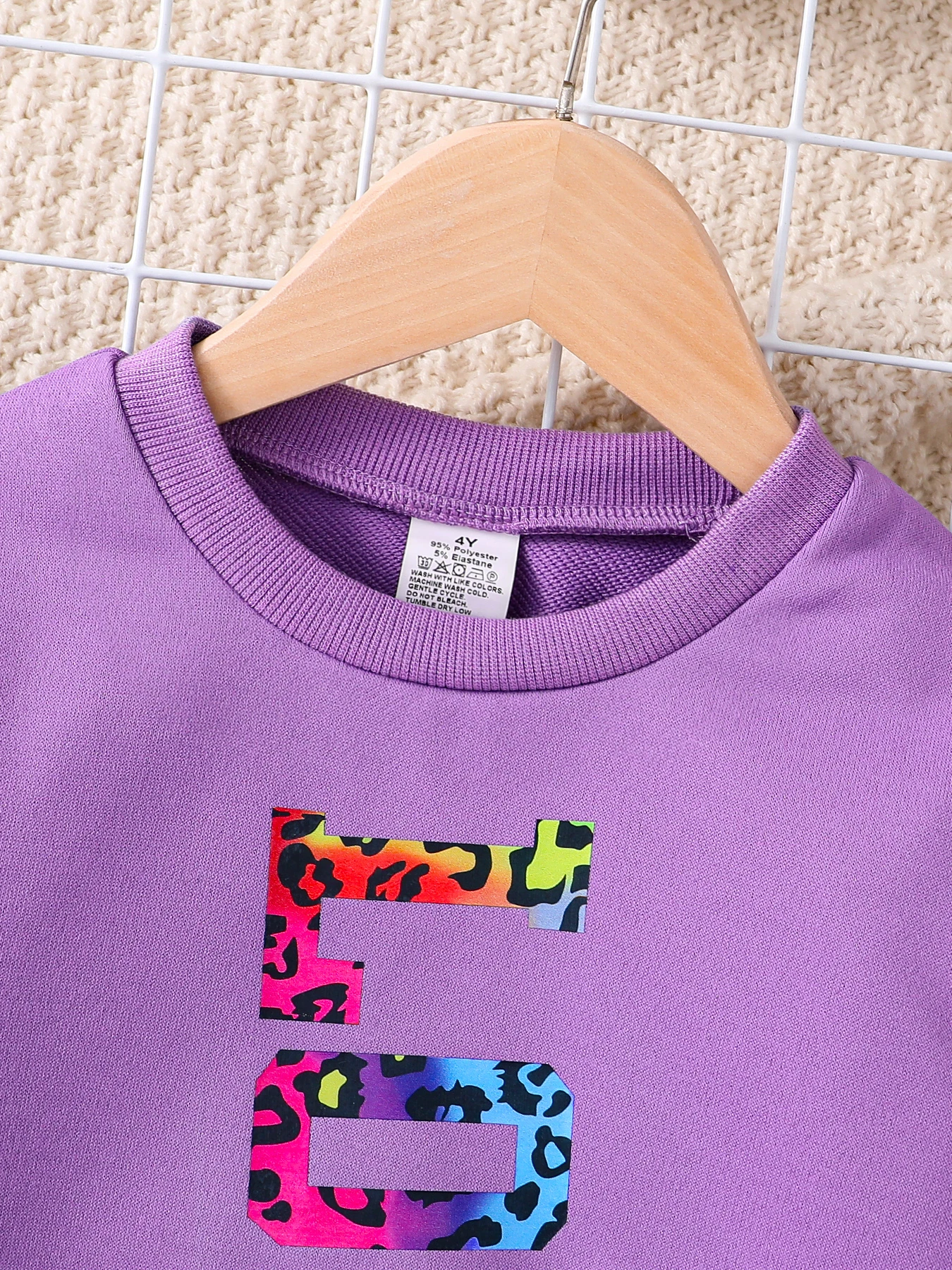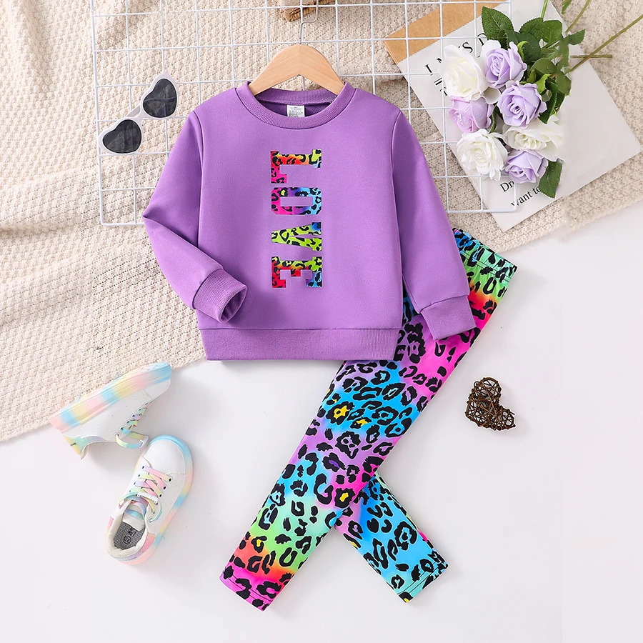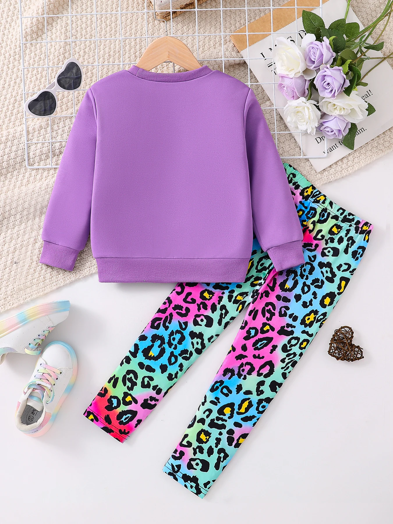 Children’s and Women’s Autumn Fashion Set 2-piece Set Purple Knitted Round Neck Long Sleeve+Multi Color Leopard Pattern Pants