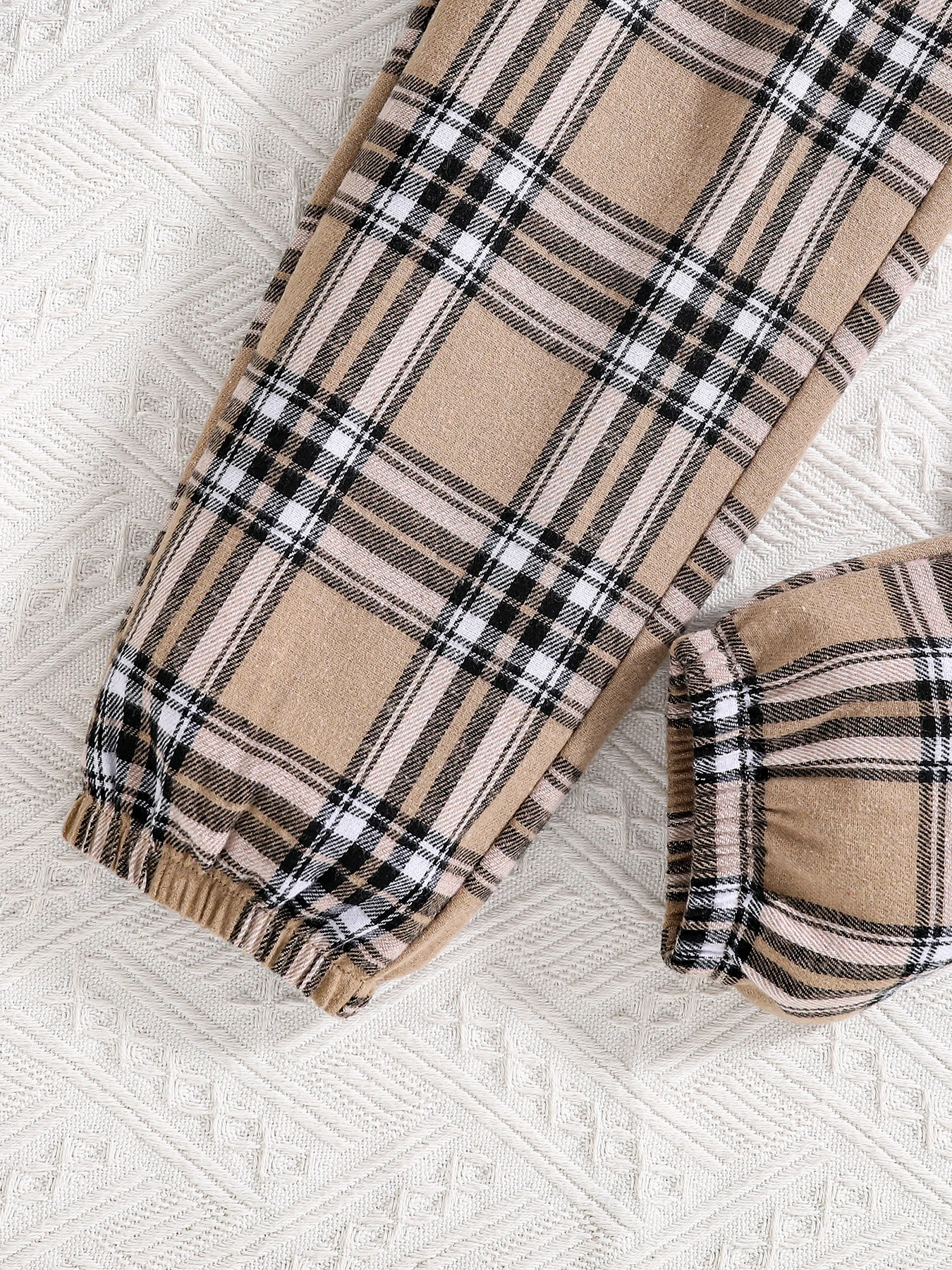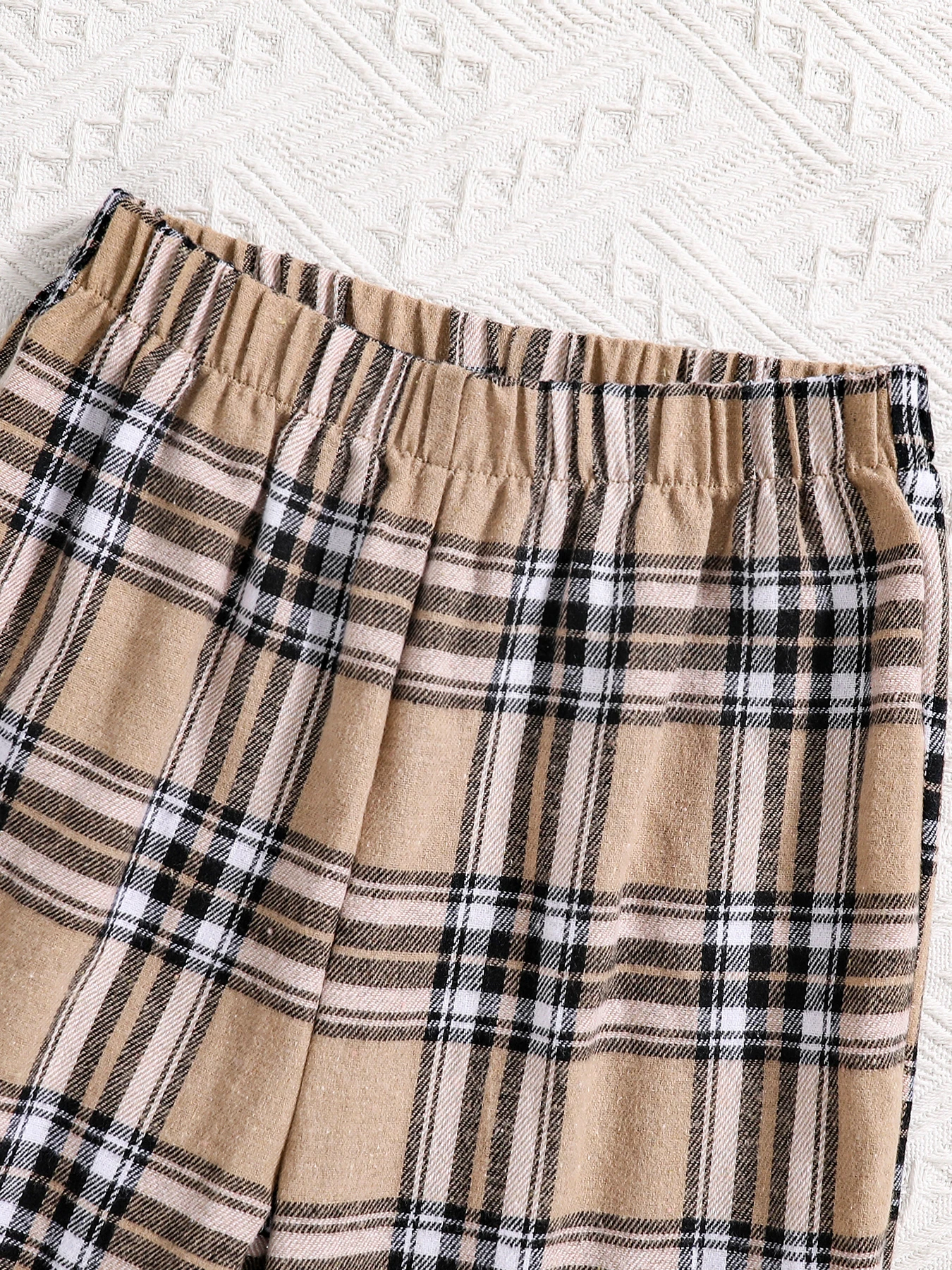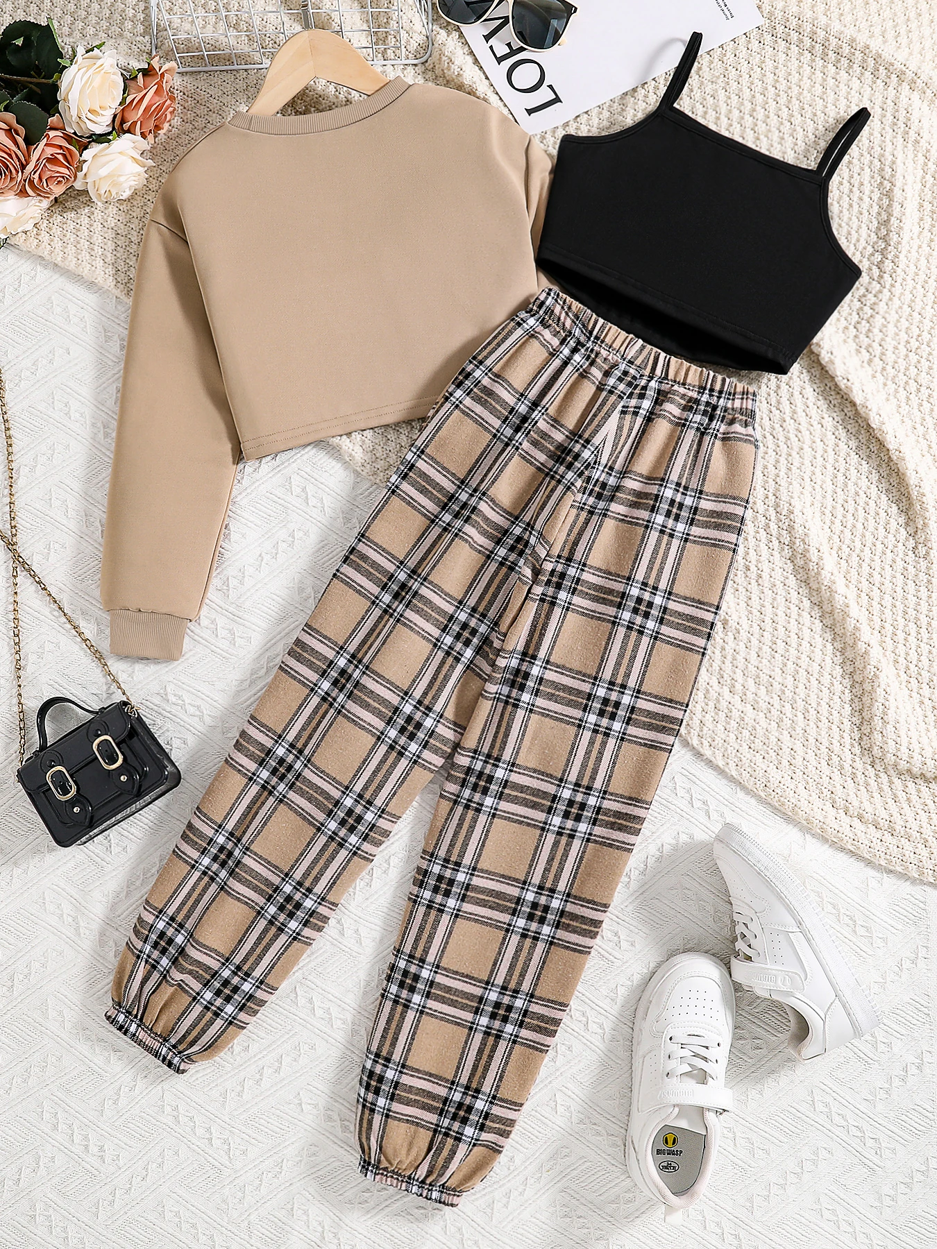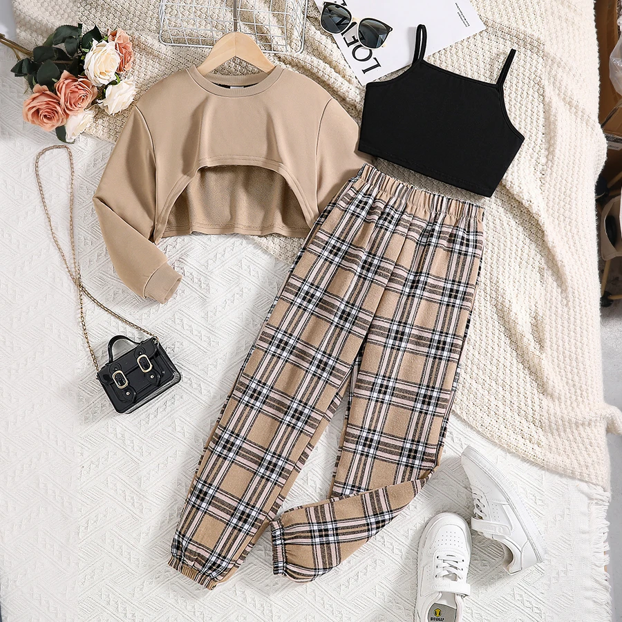 Spring and Autumn New Children’s Fashion New Girls’ Set 3-Piece Khaki Round Neck Long Sleeve Short+Black Strap+Checkered Pants
